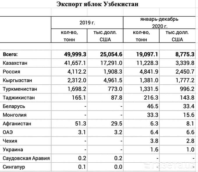 Резкое снижение экспорта во многом связано с Казахстаном, который был основным рынком сбыта для узбекских яблок в 2019 году. В 2020 году эта страна сохранила лидерство по поставкам, но их объём упал на 73% — с 41,6 тысяч тонн до 11,2 тысяч тонн.